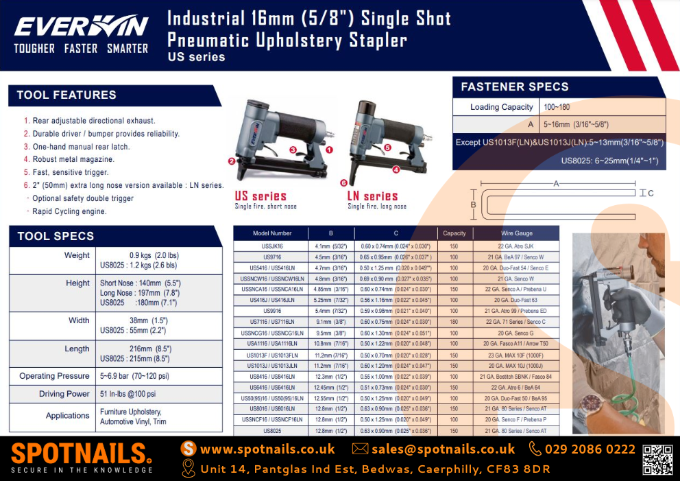 Compact and durable, the US7116 offers best-in-class performance for fine wire stapling applications. Powered by a robust motor and designed for ergonomic comfort, it ensures all-day reliability without snagging or scuffing fabric.